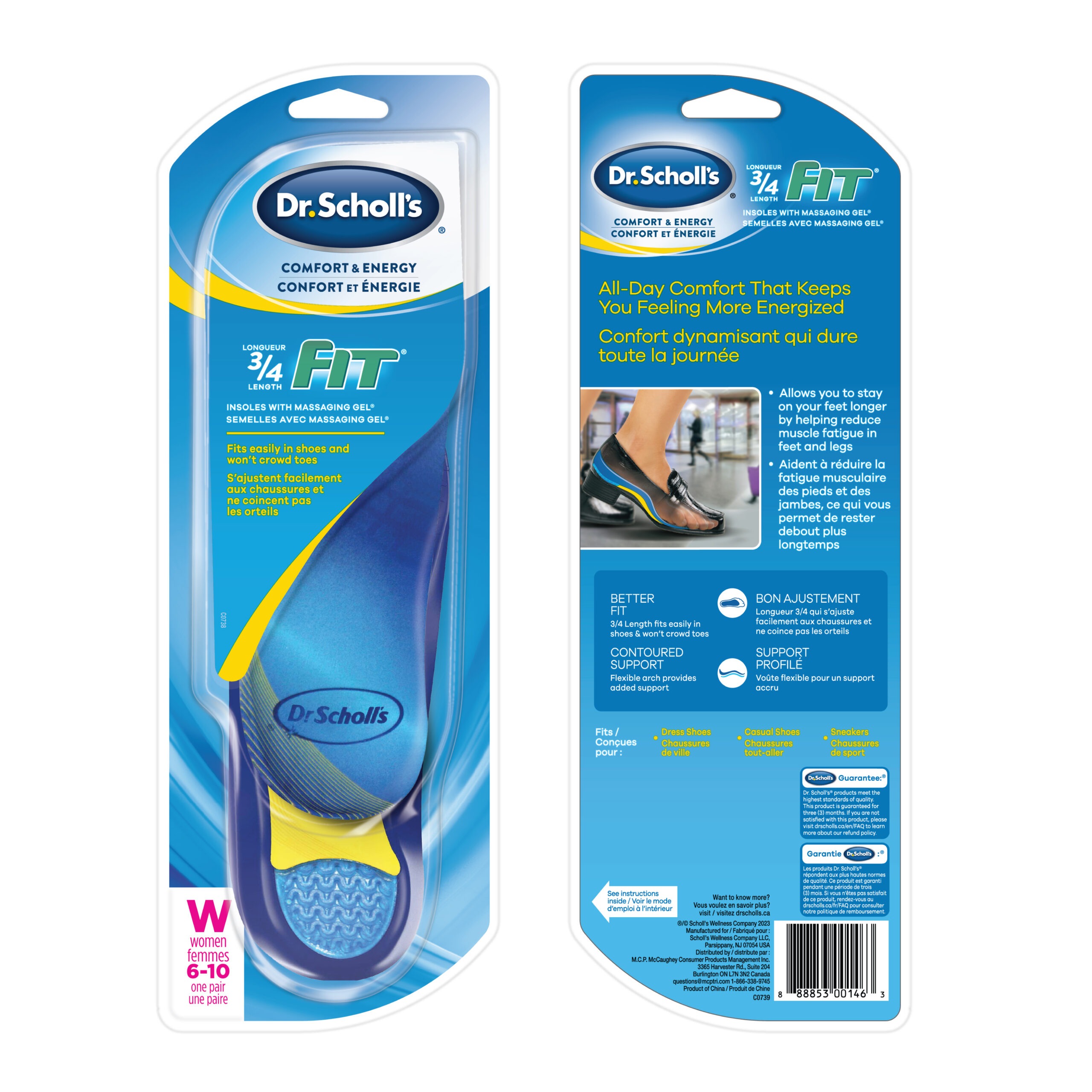 - Dr. Scholl’s Comfort & Energy ¾ Fit Insoles with Massaging Gel® provide the feel and comfort of Massaging Gel in a ¾ length design that will not crowd your toes and that can be used in multiple pairs of shoes. They provide relief of tired, achy feet and muscle fatigue for all-day comfort.